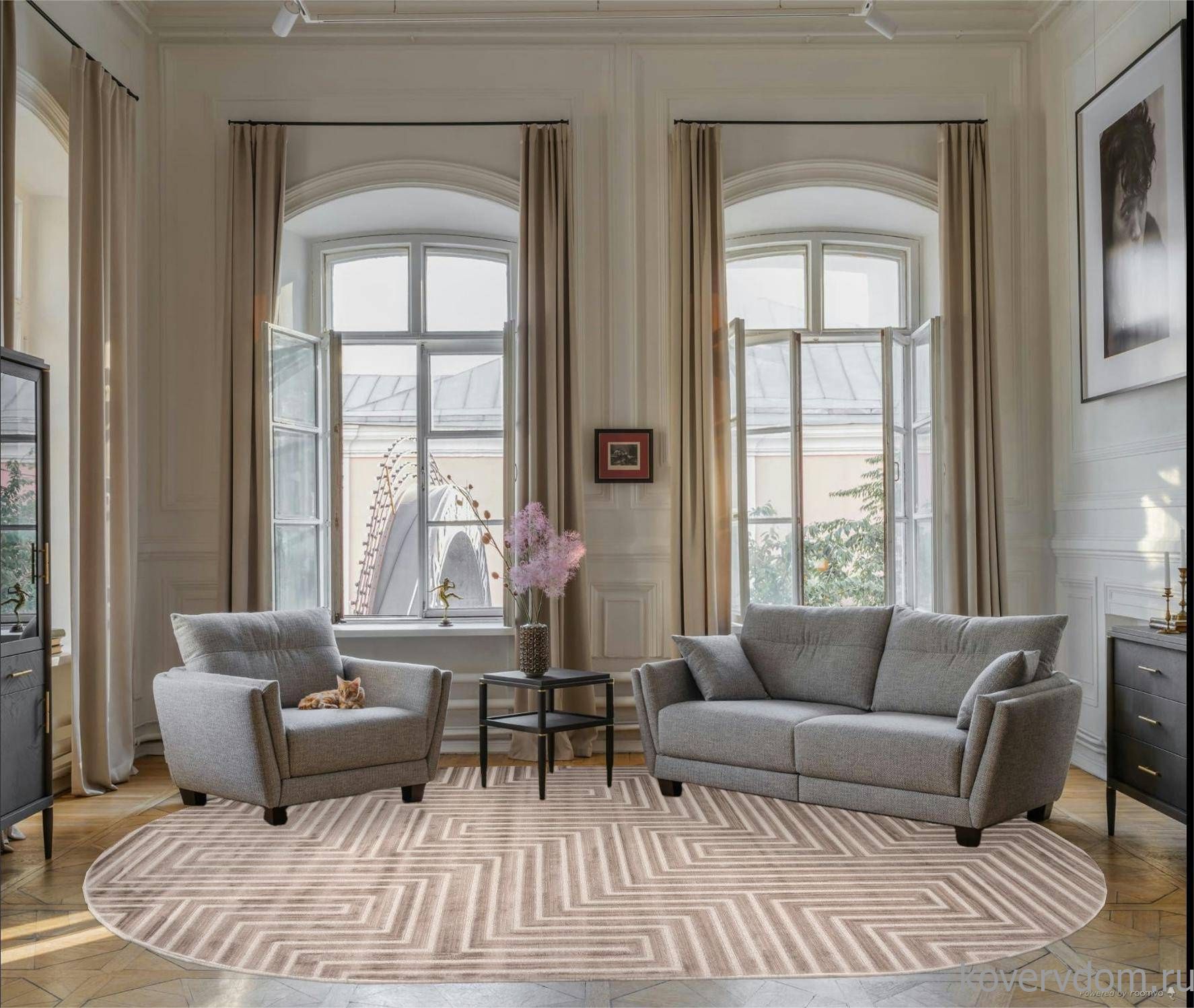 Если этот ковер овальный, то это удобный вариант для того, чтобы постелить его в зал. За счет особенностей дизайна, он станет изюминкой интерьера.